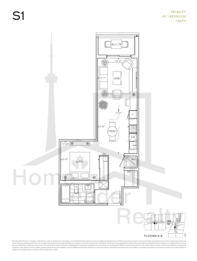 1W+D 1.5 Bed , 2 Bath 635 SQFT North