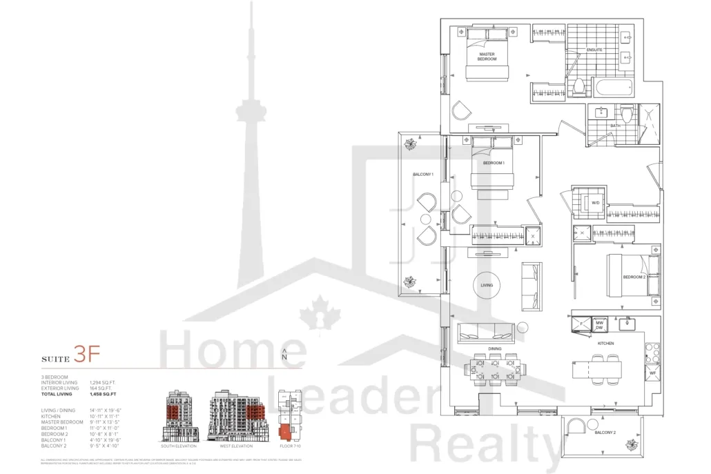 3F 3 Bed , 2 Bath 1294 SQFT south west