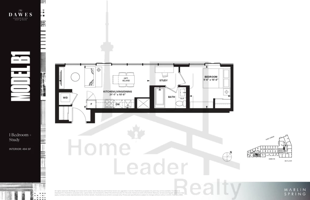 B1 1.5 Bed , 1 Bath 494 SQFT East