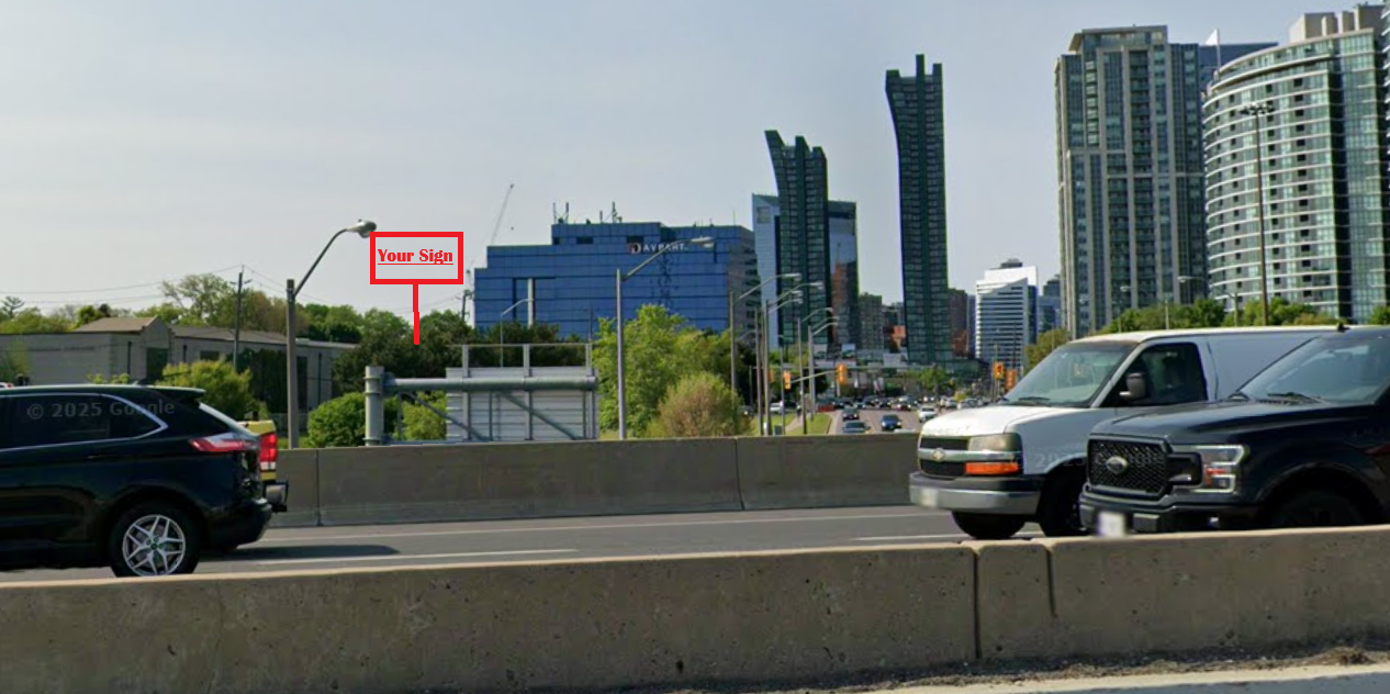 The adjacent 8-storey building features a sign positioned around the 7th floor (over 60 feet high), offering unobstructed visibility from both Yonge Street and Highway 401. There are no trees or seasonal obstructions—it remains fully visible year-round.