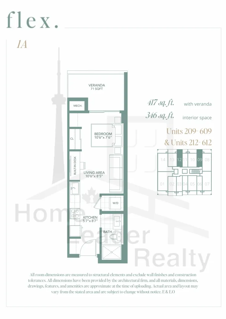 1C+D 1.5 Bed , 1 Bath 597 SQFT north