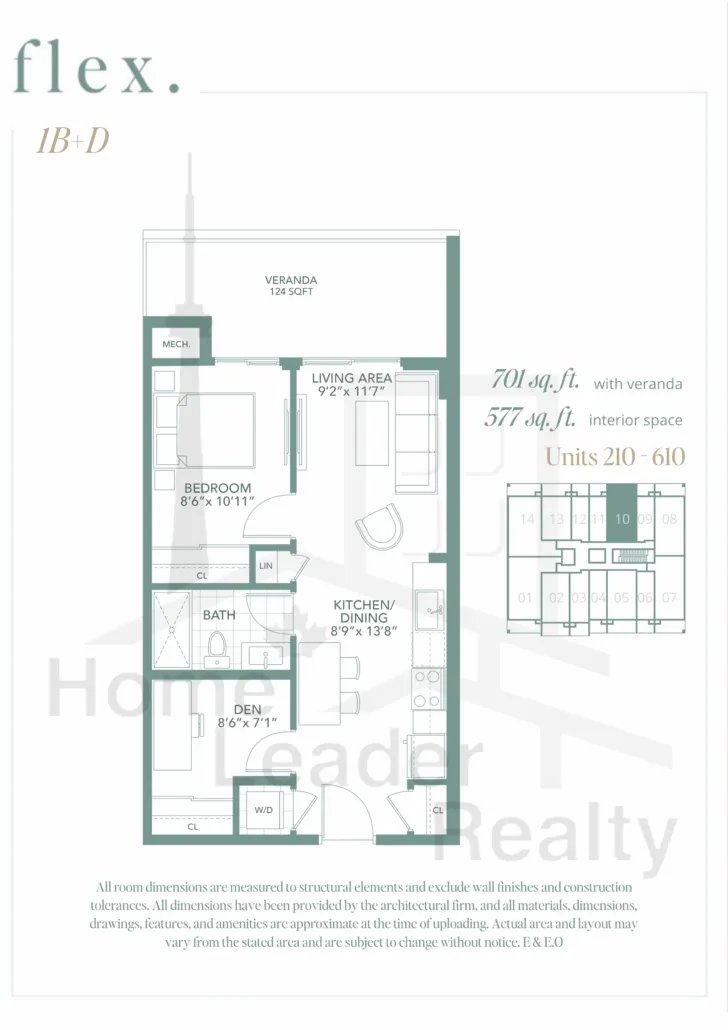 1D+D 1.5 Bed , 1 Bath 625 SQFT South
