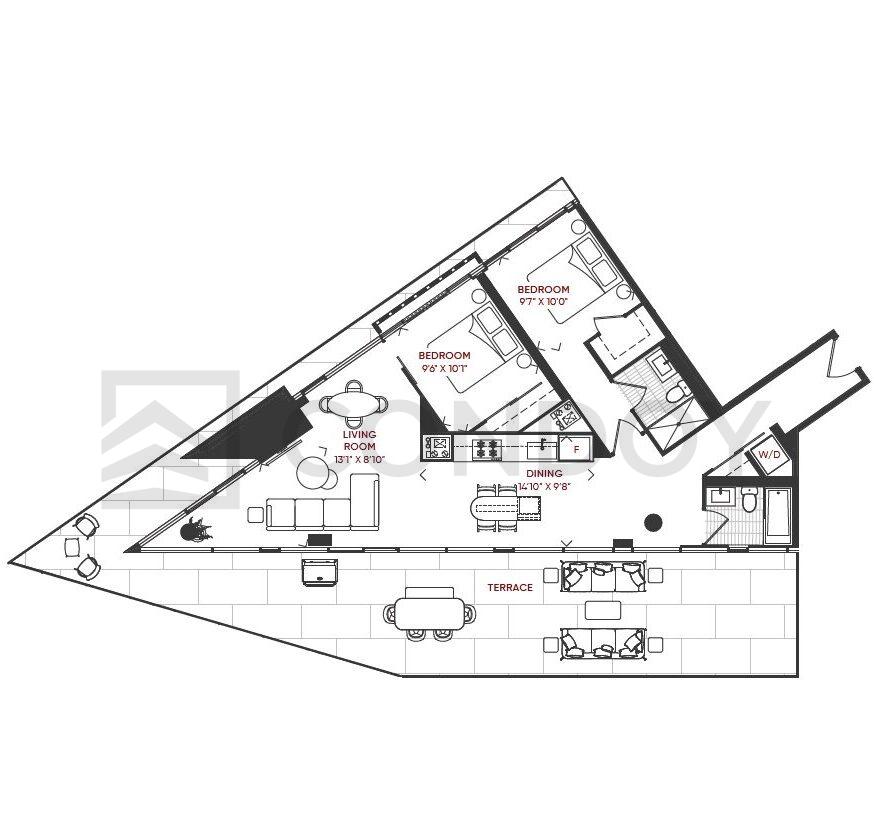 2B_F (Terrace) 2 Bed , 2 Bath 677 SQFT West
