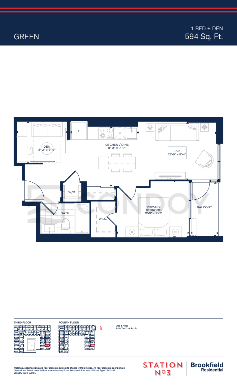 Green 1.5 Bed , 1 Bath 594 SQFT East