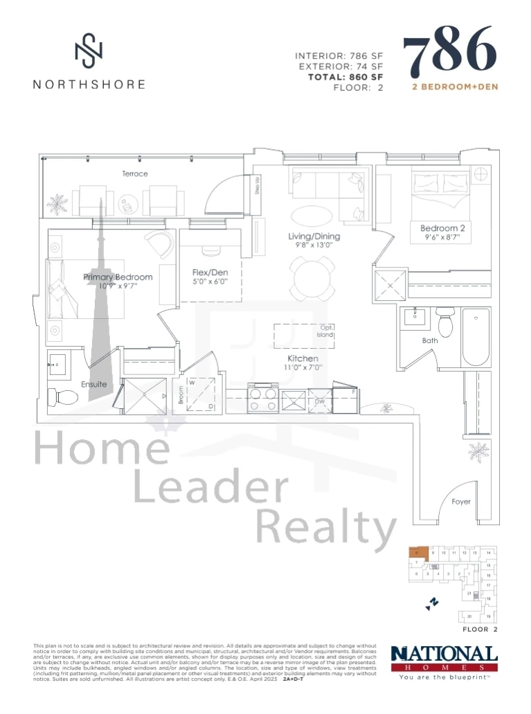 2H 2 Bed , 2 Bath 862 SQFT South West