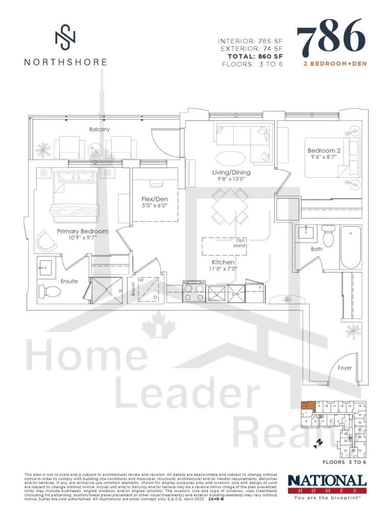 208 (786sqft) 2.5 Bed , 2 Bath 786 SQFT North West