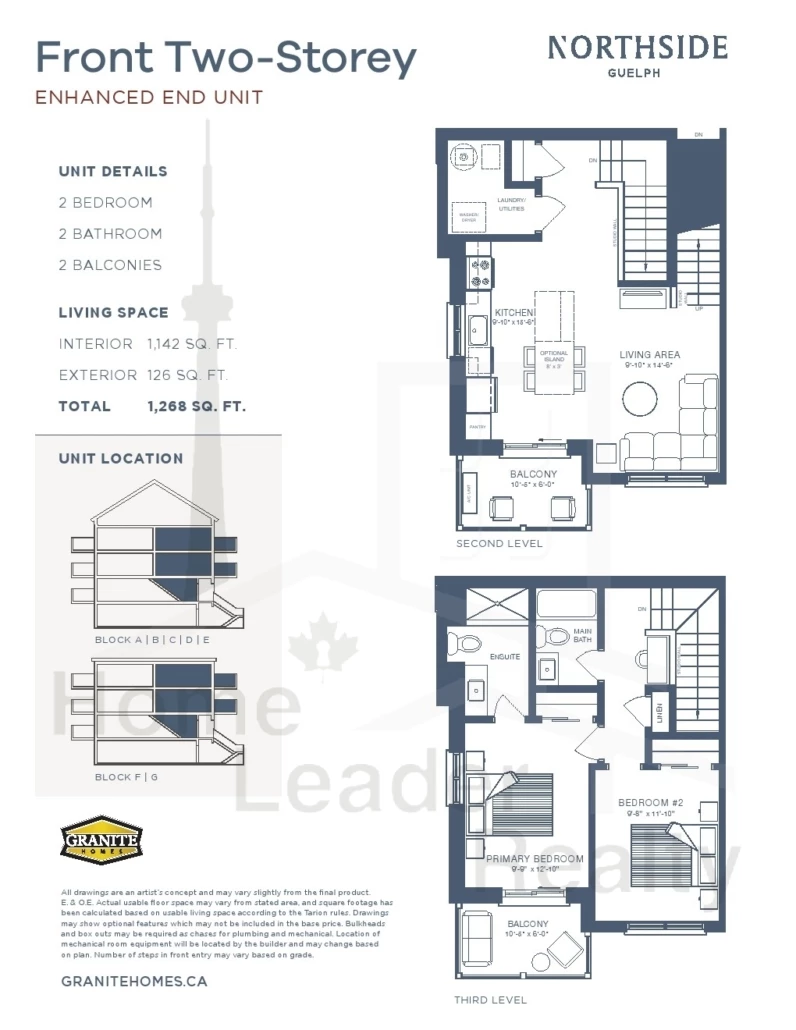 Front Two-Storey Enhanced End Unit 2 Bed , 2 Bath 1142 SQFT