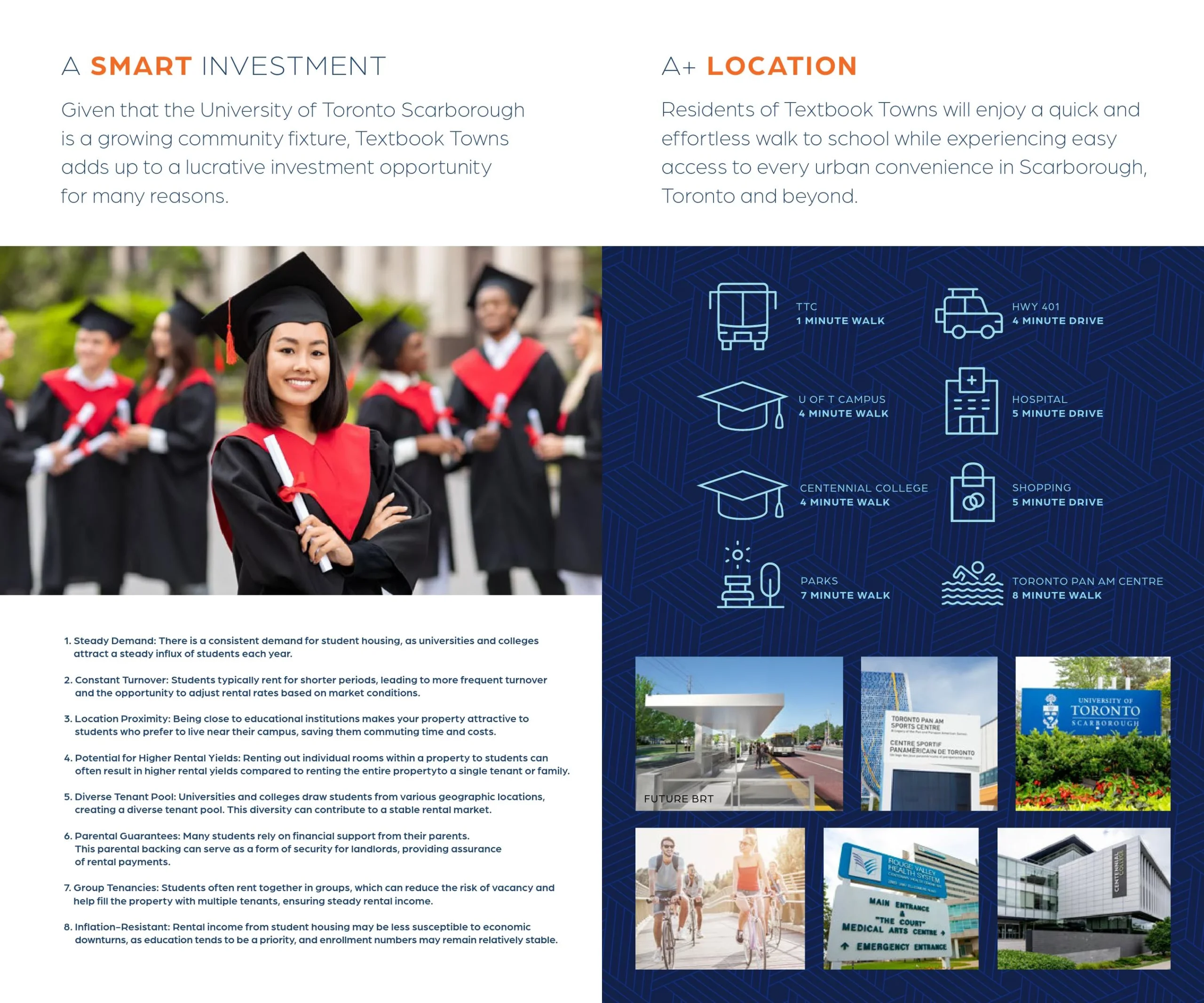 Whether you’re looking to invest or to find a new home, Textbook Towns provides unparalleled access to the best of Toronto living. Its proximity to major campuses, easy transit access, and surrounding natural beauty make it a haven for students, families, and professionals alike. For investors, the opportunity to capitalize on an expanding student market and a future transit hub makes it an appealing prospect for both immediate and long-term gains.