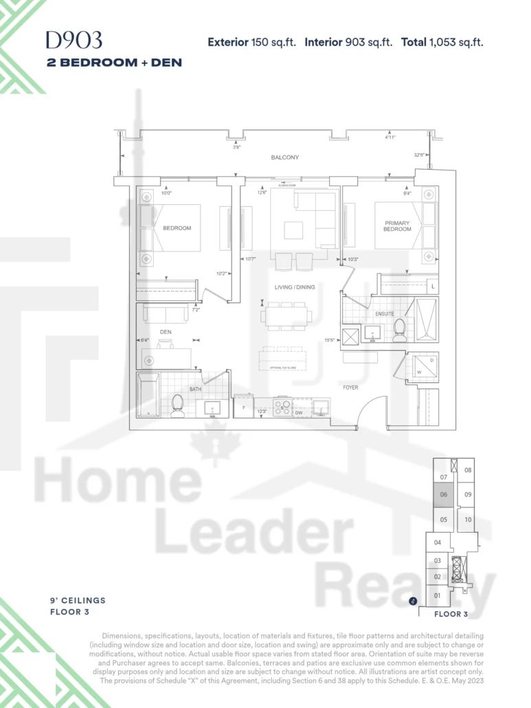 904 2B+D 2.5 Bed , 2 Bath 957 SQFT South West