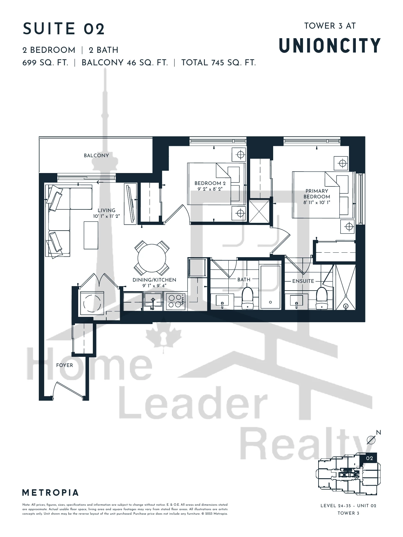 SUITE 02 - TOWER 3 2 Bed , 2 Bath 745 SQFT North East