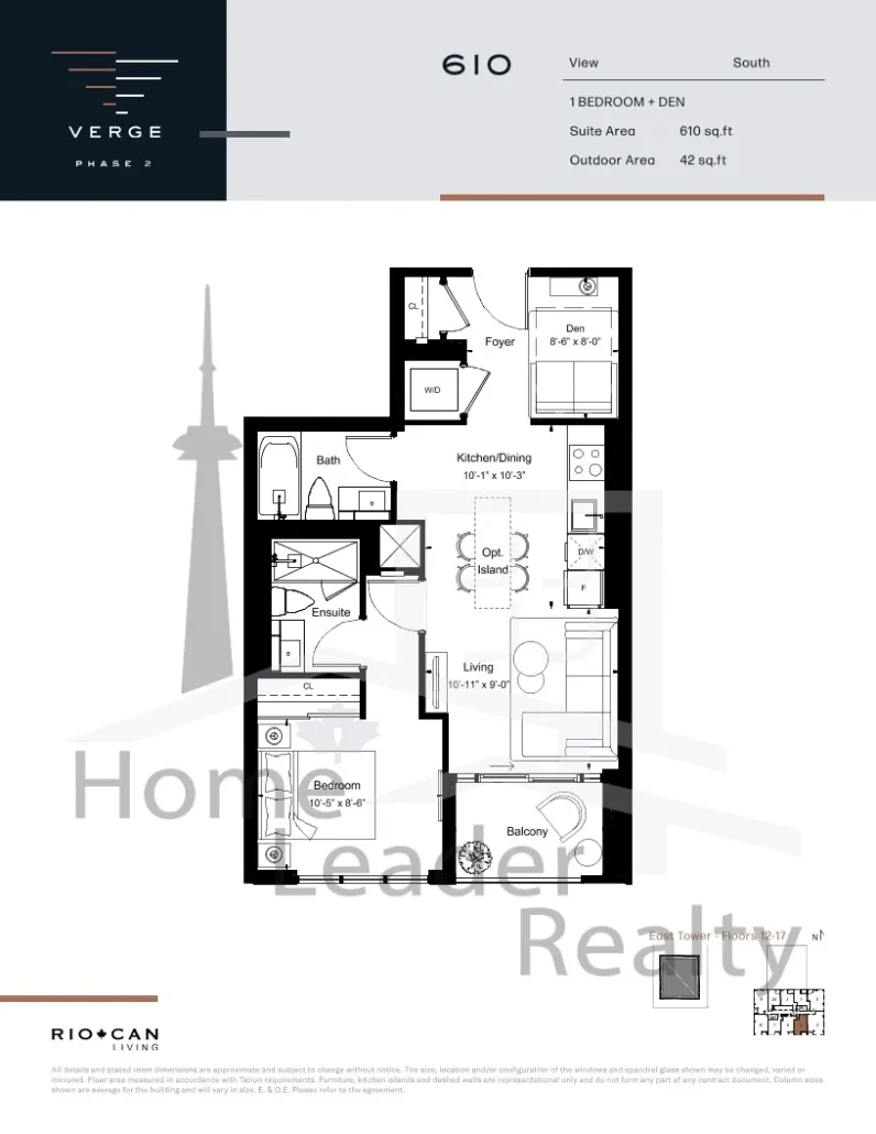 Suite 612 1.5 Bed , 1 Bath 612 SQFT East