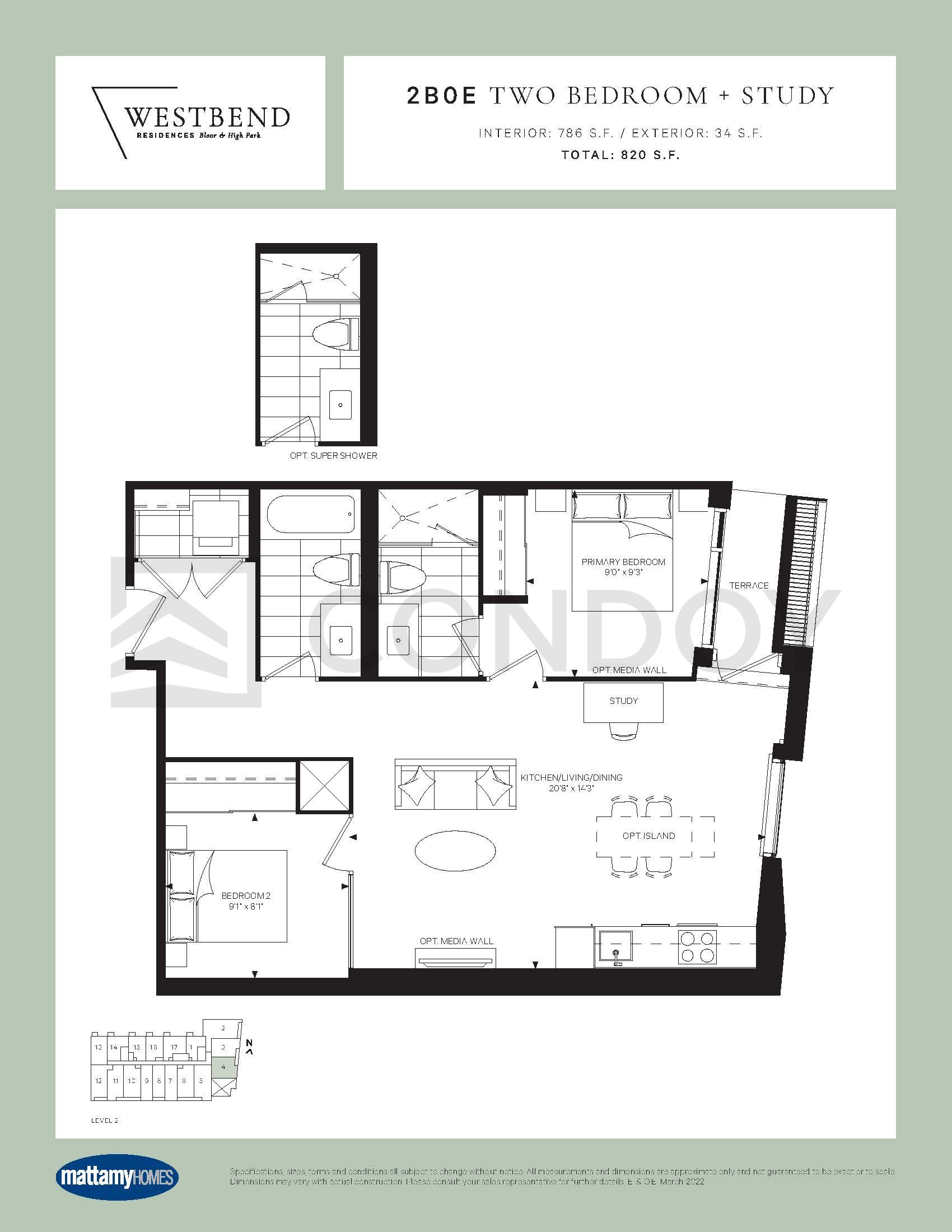 2B0H 2 Bed , 2 Bath 789 SQFT South / West