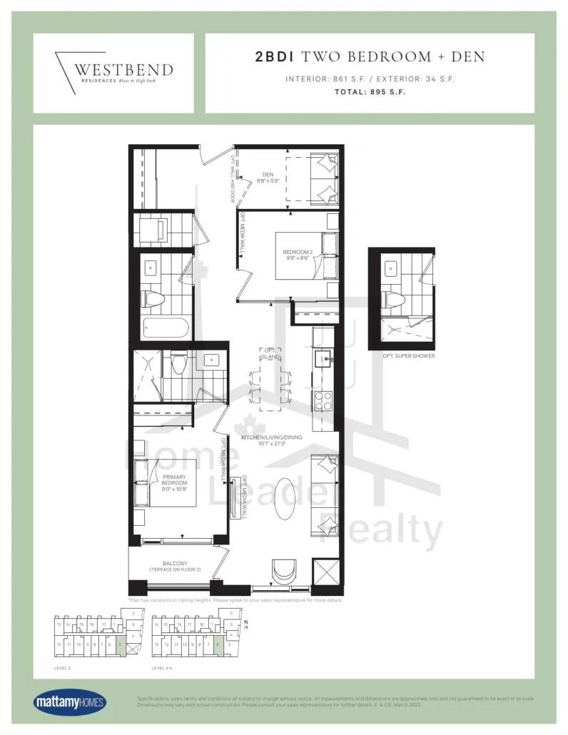 2B0H 2 Bed , 2 Bath 789 SQFT South / West